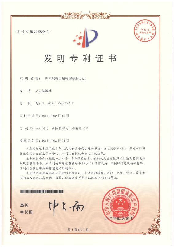 2017年2月1日,國(guó)家知識(shí)產(chǎn)權(quán)局頒發(fā)河北一森園林綠化工程股份有限公司“一種大規(guī)格白蠟樹的移栽方法”發(fā)明專利證書,專利號(hào)ZL201410480746.7,證書號(hào)2365266。本發(fā)明專利涉及樹木的移栽技術(shù)領(lǐng)域,移栽成活率高,投資少,簡(jiǎn)單易行,效果好,效益高。在園林綠化工程中作用突出,好掌控,效果顯著。河北一森園林已建成全國(guó)知名的大規(guī)格白蠟基地,在本發(fā)明專利方法的指導(dǎo)下,大規(guī)格白蠟的移栽成活率高達(dá)95%。
